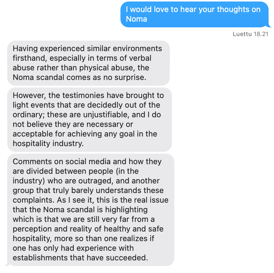 “I feel like a lot of people in the comments have never worked in kitchens, and if they have, not at the level noma used to operate. If you did you would see that all of those actions and decisions made noma what it is. The work is relentless. You need to be strong, mentally and physically. You need to be dedicated. This is the choice you make when being the best, and I respect it.”